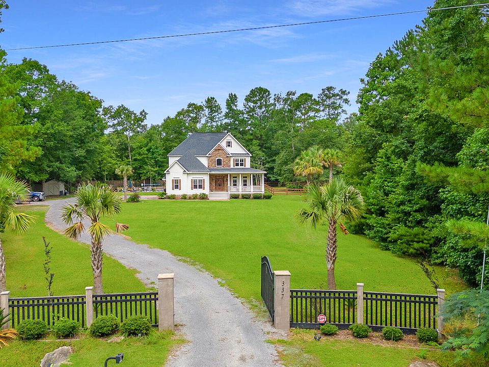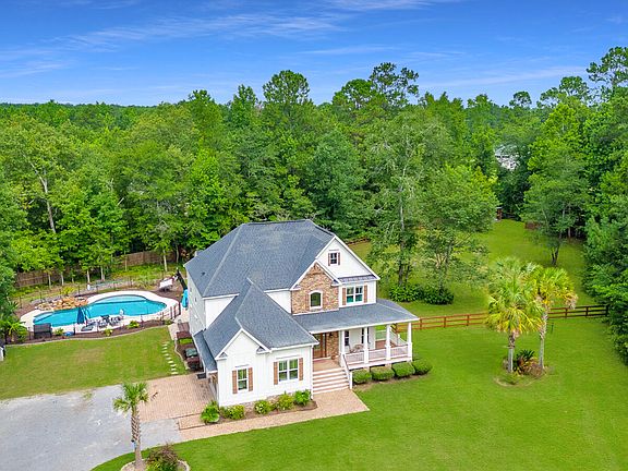 Introducing this exceptional custom built estate, embodying the epitome of luxury and functionality! Step inside and be captivated by the timeless elegance that surrounds you. From the meticulously crafted staircase in the grand foyer to the exquisite hardwood floors and custom moulding, every detail exudes sophistication.The open concept design on the main floor seamlessly blends spaciousness with purpose, providing the perfect layout for every aspect of your life. Picture yourself basking in the warm glow of the custom-built, dual-sided gas fireplace, whether it's on your enclosed patio or while sharing a delightful family meal. The kitchen, adorned with tall, custom cabinets, offers ample storage for all your culinary needs. Adjacent to the kitchen, discover a versatile flex spaceideal for a home office or any other creative endeavor. Journeying upstairs reveals a sanctuary of comfort with four bedrooms, two bathrooms, and a conveniently located laundry room, elevating the ease of daily living. The exterior of this estate matches the allure of its interior, radiating beauty and tranquility. Nestled amidst nature and secured by an automatic gate system, this private haven invites you to savor a serene ambiance. Picture yourself enjoying a tranquil morning coffee on the porch or indulging in an evening glass of wine by the enchanting poolside. With over two and a half acres of land, the potential for creating your dream oasis knows no bounds. Noteworthy highlights of this exceptional property include: - Expansive over two and a half acre lot - Saltwater pool featuring a mesmerizing waterfall - Dual-sided gas fireplace with an exquisite natural stone wall - Horse pasture complete with two run-in sheds - Enchanting landscape lighting illuminating the surroundings - Inviting stone patio for outdoor gatherings - Stunning Carrara marble backsplash in the kitchen - Custom closet in the owner's suite, offering personalized elegance - Luxurious Carrara marble flooring in the upstairs bathroom - Two convenient outdoor storage sheds - Automatic privacy gate for added security and convenience - Generously proportioned rooms providing ample space - Just minutes away from I-26, Nexton, and Canebay, ensuring easy accessibility - Expanded foundation, offering enhanced stability and future potential. This custom built estate, situated on a vast expanse of land, harmonizes elegance, functionality, and natural beauty, providing an extraordinary living experience that exceeds your every expectation.