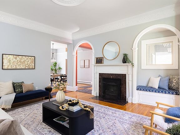 Set in an exquisite Victorian-era residence, conveniently located near Harvard Square, this beautiful condo lives like a single-family home across two levels, blending old-world charm with modern updates. The private side entry opens to a large foyer leading to a living room adorned with intricate molding, a fireplace, bow windows, a window seat, arched doorways, and elegant bookcases. The spacious dining room, framed by a wall of windows, leads through to a kitchen featuring cherry cabinets, granite countertops, and stainless-steel appliances. Upstairs, the expansive primary bedroom has a custom closet, accompanied by two additional bedrooms—one with a bookcase. The renovated full bathroom is appointed with marble countertops and double sinks. Enjoy a lovely yard and patio, gleaming hardwood floors, high ceilings, newer windows, storage, and garage parking. A true Cambridge gem!