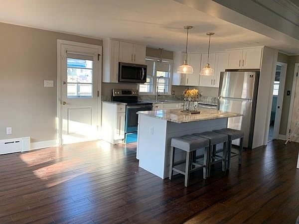 Single Family: Beautiful 3 bedroom 1.5 bath New England Cape tastefully remodeled. Granite kitchen counters, stainless appliances, hardwood floors, ready to rent to a qualified tenant. Credit check, background check, tenancy history check, application, references and previous 2 landlord references are part of our application process; water views from all bedrooms, living room, dining room and kitchen. Washer, dryer hookup in basement. Tenant responsible for utilities and water. Certified service animals only. No other pets, no exceptions. Oil heat.