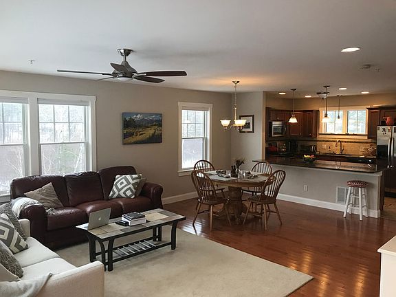 End unit condo for rent at Quarry Hill, available March 1! 2 bedrooms, 2.5 bathrooms. Large bedrooms with full en-suite bathrooms and walk-in closets, plus half bath downstairs. Snow removal, trash, lawn, and outdoor maintenance included. Deck off kitchen perfect for relaxing outdoors or entertaining. Oversized garage with built-ins (plenty of space for storage) and 1 additional parking space. Designated parking areas available for visitors. Washer/dryer included. Walking distance to DHMC and Centerra Park, 4 miles to Dartmouth College. Condo backs up to hundreds of acres of Boston Lot trails, perfect for hiking, mountain biking, and enjoying the outdoors. Furnishings and pets negotiable. Non-smoking only. Enjoy life in this convenient, quiet, immaculately maintained condo association! Owner pays trash, snow removal, lawn, and outdoor maintenance. Tenant responsible for heating, electricity, water, cable/internet.