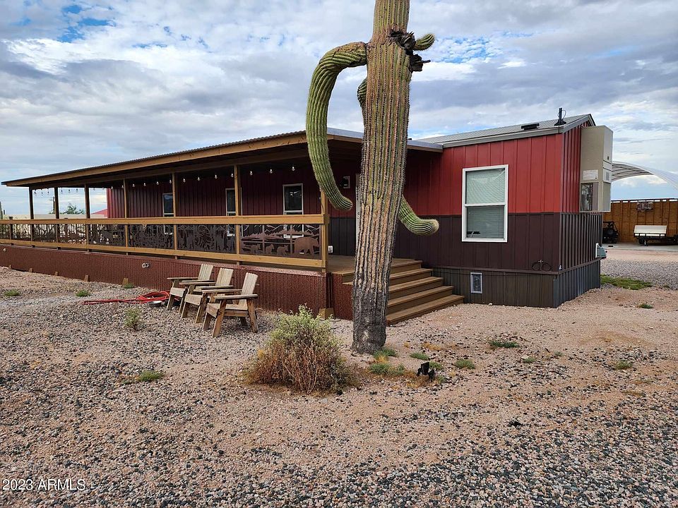 Snowbirds Dream! This property has it all for easy, casual, care-free living. Super scenic lot with BLM land across the street. Perfect for wild life views in their original habitat from the 1500 ft. wrap-around deck. 800 sq. ft. of deck is covered in a beautifully designed deck cover, protecting from rain and sun. Totally fenced, with electric gates, ample living quarters with ''emphasis on living large''. Manufactured home is approx. 1,000 sq. ft. with an extra large 1500 sq. ft. deck for maximum entertainment of friends or even a larger party, large 40'x40' covered parking area with 4'' reinforced concrete, 2 large storage container - totally varmint-proof, Ring security lights in front and back. More than a dozen mature saguaro cactuses on property. Shared well agreement is in plac