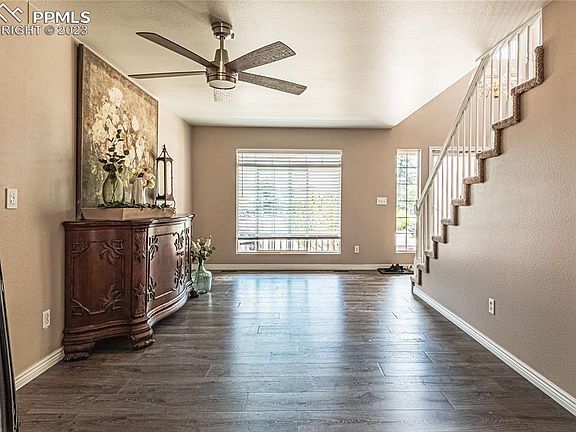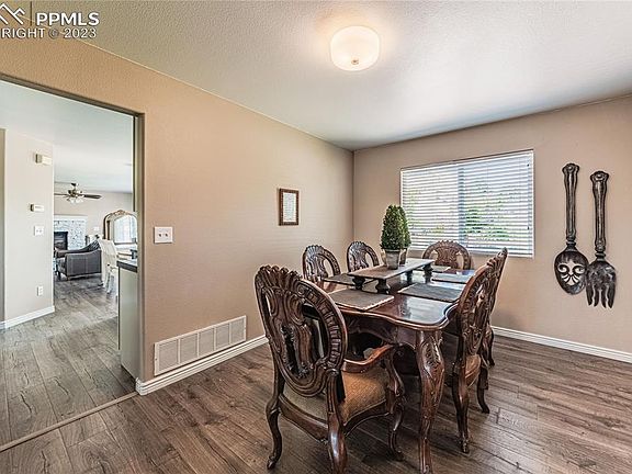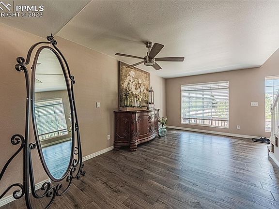 This beautiful two-story home in Monument offers a variety of attractive features. The main level includes two living spaces and two eating areas, providing ample room for entertaining guests. The family room is equipped with a gas fireplace, creating a cozy atmosphere. The kitchen has been remodeled and features pull-out drawers, two pantries, and is plumbed for a gas stove. The sale of the home includes all the new appliances. The main and lower levels of the house have been updated with new flooring and paint. Upstairs, you will find four bedrooms, each with ceiling fans for added comfort. The master bedroom includes a spacious private bathroom with a double vanity, soaking tub, and two closets. The convenience of having the laundry located on the upper level is an added bonus. In the basement, there is a fifth bedroom with a double closet. The basement also offers a second family room, providing additional space for relaxation and entertainment. It includes an extra pantry/storage space and a bathroom with a shower. Outside, you can enjoy the corner lot with a patio and pergola, perfect for outdoor gatherings. The gas line for a barbecue is available, and the newer fence adds a contained area for pets. Additionally, the front yard offers beautiful mountain views. Enjoy the air conditioning, and all window coverings are included. NEW ROOF is coming soon! Parking is made easy with an oversized 2.5-car garage. The location provides easy access to I-25, making commuting convenient.