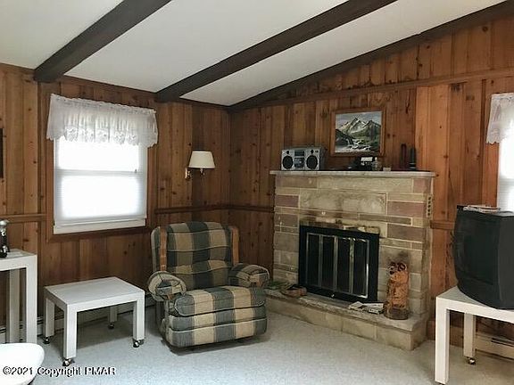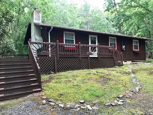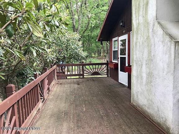 HIGHEST AND BEST BY 6-27 @12 NOON Rare find bordering state land and easy stroll to several lakes and club house this home nestled in laurels is the perfect Pocono mountain getaway ! bright and sunny open concept all cedar interior with cathedral ceiling and skylights 3 bedroom , stone fireplace and large wraparound deck