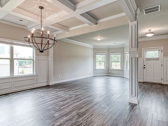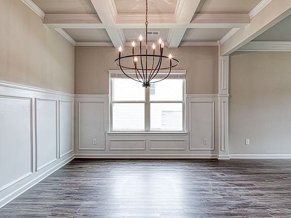 Open concept kitchen with large island overlooking the great room.Private guest suite is spacious and bright perfect for a home office or even a quiet library.Primary suite with a sitting room, expansive walk-in closet, dual vanity, tub, and oversized shower.Dining room with coffered ceilings.