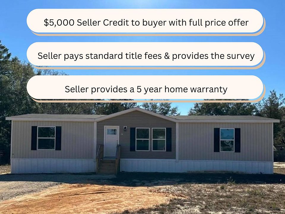 BACK ON THE MARTKET AT NO FAULT OF THE SELLER *Seller is offering a $5,000 credit to buyer with a full price offer* This 3 Bedroom 2 Bath Manufactured Home is move in ready! This home is ENERGY STAR RATED with upgraded insulation, OSB Wrap with House Wrap, Lux Low E Thermo-Pane Windows that fold down for easy cleaning. There is a beautiful framed decor accent wall in the living area & wall to wall vinyl plank flooring throughout the entire home. Kitchen is equipped with deep stainless steel kitchen sink, full cabinet/wall encased around the refrigerator, kitchen island and a fantastic coffee bar set-up just off of the kitchen. The master bathroom features a double vanity and stand up shower, with 2 walk in closets, one being in the master bathroom and the other is in the master master bedroom. Guest bedrooms both have walk in closets. The seller provides a 5 year home buyer protection plan in place at the time of a successful closing. This home is located only about a 15-minute drive from historic downtown DeFuniak Springs, an hour drive to the beautiful white sandy beaches of South Walton, and about a 20 minute drive to Crestview. Give us a call to schedule your showing. Check out the virtual tour uploaded with the photos. Staged photos and virtual tour are of the model home and may have a few different features.