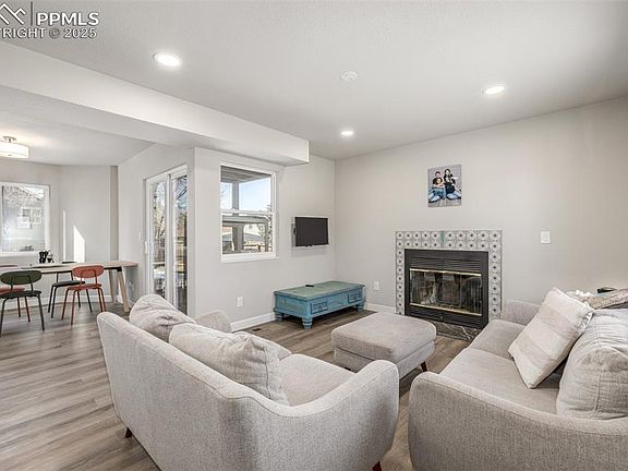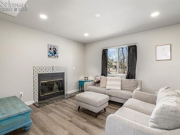 Step into a home that combines thoughtful updates with timeless design, creating a space that is as inviting as it is functional. The classic exterior, highlighted by clean lines and a charming blue front door, welcomes with a large, flat yard shaded by a mature tree. Inside, the modern wide-plank luxury vinyl flooring introduces a sense of warmth and style, seamlessly leading to the heart of the home. The living room exudes a cozy sophistication, centered around a beautifully tiled fireplace that adds both character and focus to the space. From here, the layout flows effortlessly into a bright dining area, where natural light enhances the airy ambiance. Adjacent, the kitchen is a masterclass in minimalist elegance, showcasing chic white cabinetry, a gleaming glass subway tile backsplash, and stylish quartz countertops. Stainless steel appliances complete this thoughtfully designed culinary space, where style and practicality coexist. Upstairs, the primary bedroom offers a serene retreat, complete with a private balcony and a refined ensuite. A secondary bedroom on this level is equally appealing, with generous proportions and abundant natural light streaming through large windows. The finished lower level expands the home’s versatility, providing a third bedroom, additional bath, and a flex space that adapts to a variety of needs. The outdoor spaces are equally captivating. The dining room leads out to a covered patio that opens to an expansive backyard, perfectly suited for entertaining, gardening, or leisurely afternoons. Mature landscaping adds charm, while a convenient fire pit invites gatherings under the stars. Situated with convenient access to Amazon, Fort Carson, and the Academy Corridor, this home offers a blend of modern updates, welcoming ambiance, and strategic location. Proximity to I-25 ensures effortless connectivity, enhancing the home’s appeal for both everyday living and commuting.