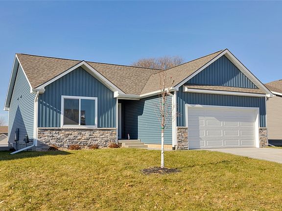 Attractive, New, open ranch plan has: 3 Beds, 3 Baths, 2,004 SF finished, 2-car garage w/ openers, 10x12 treated deck & 6-year tax abatement! As you walk in the home you will find vaulted ceilings in the main living area, electric fireplace, Waterproof LVP flooring in kitchen-living-baths-laundry, granite countertops, painted cabinets, center island, spacious kitchen pantry & SS appliances w/ refrigerator. Owners suite is tucked away in back of home for privacy & includes fan/light, double vanity, shower, & walk-in closet. The front of the home has a nice sized guest bed, bath, & laundry room. Off the garage is a big drop zone w/ mud bench. Basement is being finished & includes 1 bed, 1 bath, & living room w/ large unfinished storage room. Exterior features include no maintenance vinyl siding, 30 yr. shingles, stone, & fully sodded yard, tree in front yard, & 6 yr tax abatement. 1yr. builder warranty included. Photos online are of actual home. Use Preferred lender: Patrick Conway 515-229-1477 and get up to $2,000 in closing costs.