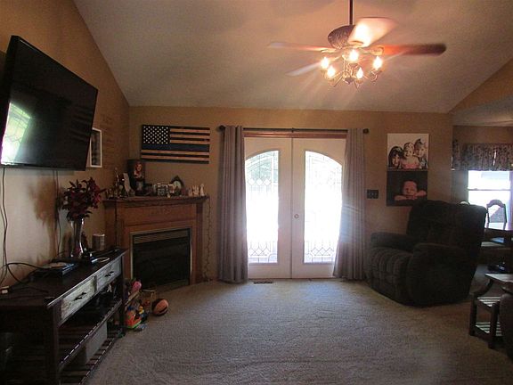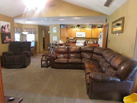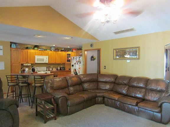 Vinyl ranch home sits on 1 acre nestled among farm ground. This 1629SF home has 3 bedrooms, 2 full baths. Master suite has walk in closet, double vanities, walk-in shower with ceramic tile. Custom kitchen with oak cabinets, large bar area for eating or quick snacks, all appliances stay. Open floor plan allow direct access to living room, dining area for gatherings. Living has gas fireplace and french doors that lead to 16 x 18 open deck overlooking back yard with fire pit. Large family room allows ample space for holiday gatherings. New triple pane windows. 44x32 Detached pole building with lean-to. This home is move-in ready and awaiting its new family!