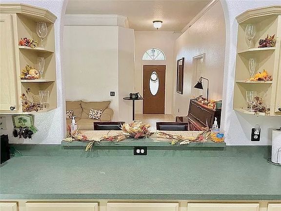 Ten acres of nature beauty and 12 feet high ceiling comfortable and spacious 4-bedroom, 3-bath pool home with den/office. From the manicured uncluttered front driveway, with fresh asphalt driveway coating, take in the country air! Enter the front screened porch through the front door. Master suite is to your left, and straight ahead is the heart of the home, a great-room that can be rearranged many ways, to suit your family's needs, freshly painted. Vaulted ceilings, high plant shelves, and crown molding bring a lovely look to this large room. There is an arched pass-through and view to the kitchen, which has blonde cabinetry, stainless steel appliances, which will all stay, and plenty of counter space. Adjacent to the kitchen is room for the breakfast table in the dinette. The master suite features a large bedroom, his and hers closets, and a private bath, which has a long counter, dual sinks plus a makeup vanity with space for a chair, garden tub, plus a step-in glass-door shower. There is also an exit door to the pool deck, think midnight swim! There is an office/den off the great room, which could serve as a fifth or guest bedroom, if needed. Two more bedrooms share the second full bath, and the fourth bedroom is next to the third full bath, with tiled step-in shower. The washer and dryer are in this bathroom, as is another door out to the pool deck. From the kitchen, exit through the sliding glass doors to the pool area, with huge, freshly painted deck large enough for all your patio furniture. The entire area is screen-enclosed, to enjoy all seasons. The view from the pool deck is spectacular and relaxing, both. There is a gazebo to the left. There is a second entrance to the property which leads directly to the back portion of the land. It can be used as a private and/or business entrance. Several sheds and outbuildings are for the animals, tools, equipment. There are 2 irrigation wells. Home is on well and septic, so no water bills! The wooded back five acres are pristine, with trails, a fire pit and gathering area.