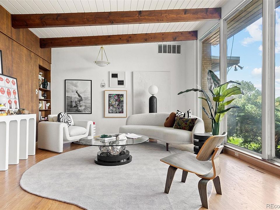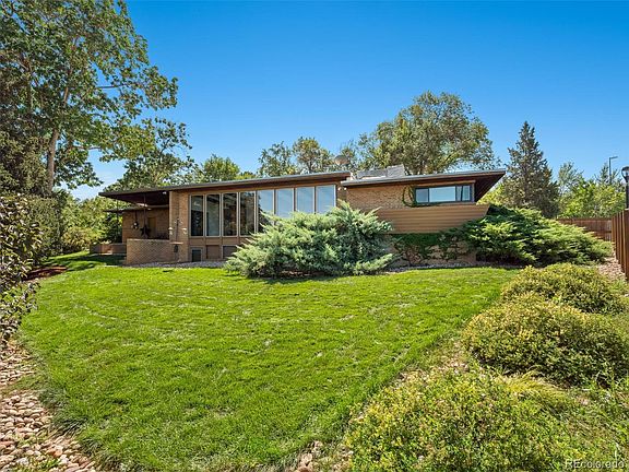 A rare architectural gem in Wheat Ridge—designed by its original owner, an architect, and lovingly preserved by just the third owner. This mid-century modern home is a dream for design lovers, filled with iconic details: a classic entryway with double-fluted architectural glass, original vintage tile, warm wood paneling, built-ins, and bold mid-century lines throughout. The main level features a spacious primary suite and two other bedrooms with original oak floors, while the dining and living rooms are anchored by a stunning wraparound flagstone fireplace and floor-to-ceiling windows that overlook a zen-inspired backyard with bold Rocky Mountain views. The walkout basement adds even more character with a second wood-burning fireplace in blonde brick matching the exterior, custom built-in original wood shelving, and original linoleum floors. 3" of Rocky Mountain Ditch water rights are also available for purchase, and the bedrooms, kitchen, and bathroom were all updated in 2023 with new Pella windows. A true one-of-a-kind residence that honors authentic mid-century design and timeless Colorado beauty.