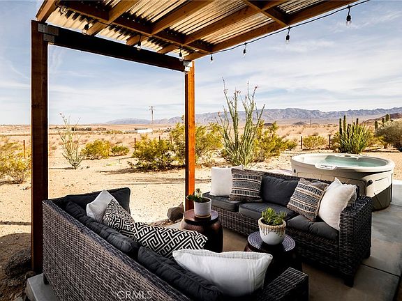 Outdoor amenities include a shaded patio, jacuzzi with fireplace and hammocks, exterior irrigation system, and corrugated steel fencing—a perfect setup for stargazing nights, cozy fireside hangs, and slow desert mornings with coffee in hand.