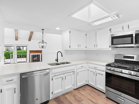 MOVE-IN READY AND STUNNING FIND in 55+ community of Esplanade! Experience unparalleled comfort and style in this charming 2-bedroom, 2-bath townhome. The open and bright floorplan features accent wood beams on the ceiling in a step-down living area with a cozy fireplace. Enjoy a separate dining area and an all-white kitchen illuminated by a skylight, adorned with quartz countertops and a chic backsplash. Recent upgrades include new flooring, fresh paint, and modern light fixtures. The low-maintenance yard and sunny patio with a lovely view offer serene outdoor living. Nestled in a quiet neighborhood, this home is perfect for relaxation and entertaining. Set up a private tour to learn more!
