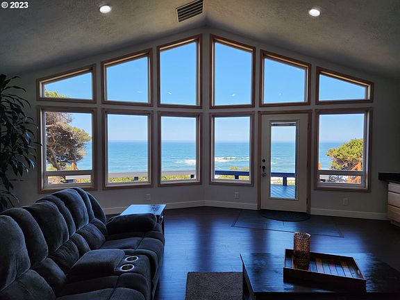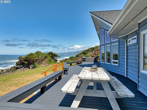 Huge Price Reduction! SINGLE LEVEL with STUNNING OCEANVIEW AND LARGE SHOP! This 3BR/2.5BA ocean-view home has been completely updated. New roof in 2022, Waterproof Composite Flooring throughout, asphalt driveway, new HVAC, all new appliances and baths were updated. Gourmet kitchen with 5 burner gas stove w/air fryer & convection oven, dishwasher, refrigerator with 2 freezer drawers, granite countertops and White Oak cabinets. Skylights add natural light in the kitchen and hallway. Walls of windows highlight the dramatic water views in the living room and the built in bookcases/cabinetry give bonus storage! The spacious Owners Suite has a romantic gas fireplace, walk in closet, a private door to the deck and hot tub and the ensuite has a gorgeous, tiled walk-in shower that mimics the ocean in its styling, dual sinks with integrated power and custom organizational drawers and heated floors. Trex Select decks on both sides of the home so you can enjoy the sunrise and the sunset! A 6-person hot tub with bluetooth and LED lights looks out over the ocean. Oversized 2 car garage with a crows nest viewing deck on the back side and storage attached. 10 x 12 storage shed complete with shelving and a 1200 SF detached 30x40 shop with its own full bath and 3 phase power. Attached carport with RV hookups nearby. Come take a look at this spectacular home with views of the water crashing onto the shoreline!