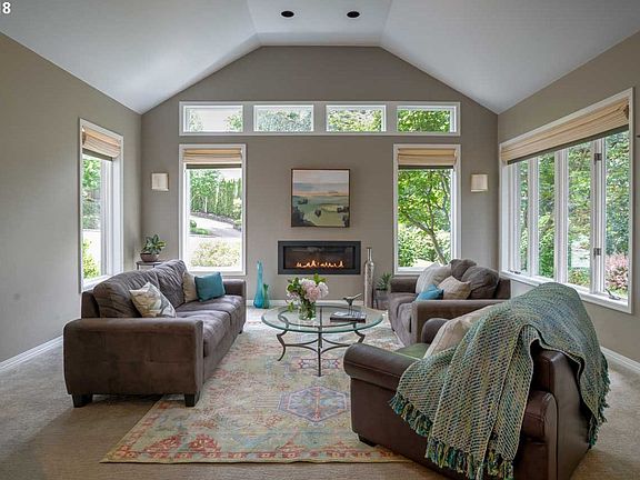 BREATHTAKING VIEW from expansive Trex decks and MABR! Stunning kit remodel incl slab granite, SS appl, Wolf 5 burner gas cooktop, wine closet; refinished red oak floors; contemp linear gas FP in FR and LR. Remodeled BAs with custom cabinets and heated tile floors. Central vac. Newer archit comp roof & solar paneling. Welcome to your dream home!