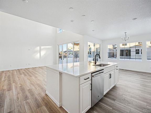 MLS#2427077 Ready Now! The Ridgway at Aurora Highlands stands out with its modern, family-inspired design and thoughtful layout with an UNFINISHED BASEMENT. At its heart, the kitchen overlooks a casual dining area, featuring a spacious eat-in island and an expansive walk-in pantry—ideal for home cooks and busy families alike. A versatile study at the front of the home can serve as an office, playroom, or multipurpose space. The great room boasts airy volume ceilings, creating an inviting space for gatherings and relaxation. Upstairs, you’ll find a private primary suite, a loft, and three additional bedrooms, providing plenty of room for everyone. The home also includes a two-car garage, a large laundry room, and an unfinished basement, offering flexibility and room to grow. Structural options added include: 12 x 8 sliding glass doors to patio, unfinished basement, glass doors at study, bedroom 4 in lieu of loft.