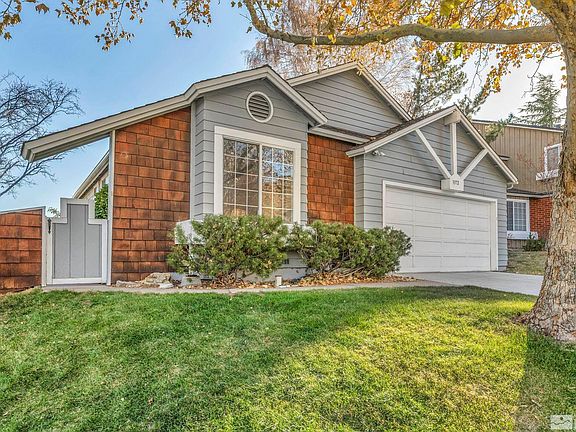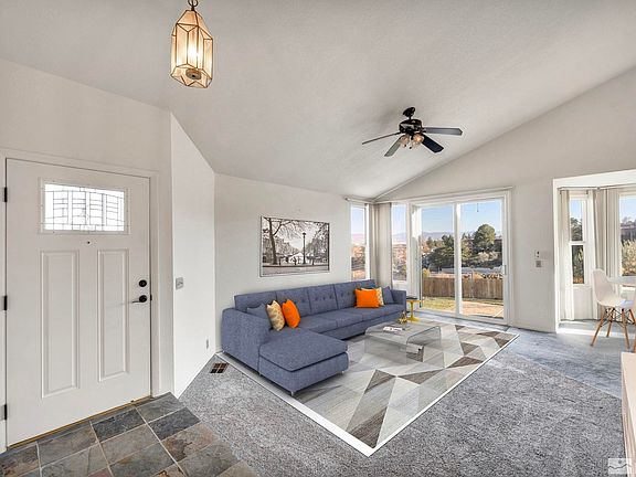 Views, Views, Views Perched on a ridge overlooking Reno is where you will find this well-kept single ceiling home. When you enter this home you're greeted with high ceilings and plenty of sunlight, and those views; city, mountains, and valley., This home is in great condition and has been taken care of by the seller. Spacious living room, formal eating area surrounded by windows, family room with raised hearth, perfect for pellet stove, beautiful slate floors. The kitchen is open with breakfast nook with skylights. There are three bedrooms, primary bedroom has two closets, one being a walk in, nice primary bath w/double sinks and are separate from the secondary bedrooms. The low maintenance yard is perfect size, it goes beyond the fence, backing to steamboat ditch.