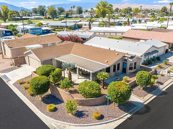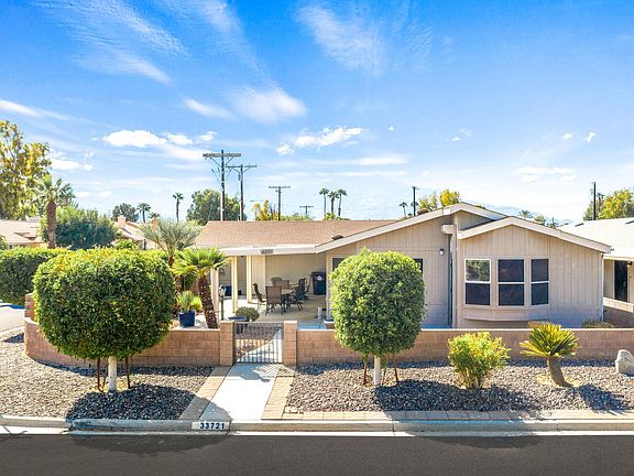 BEAUTIFUL home in a fabulous location in Tri Palm Estates & Country Club! Comfortable and stylish, this home features 3 bedrooms (3rd is currently used as a den, and includes a walk-in closet) and 2 baths. It's sited on a quiet corner lot facing the 5th hole of the community golf course. Light and bright with plenty of sunny windows, the home has been tastefully updated and features plenty of room for entertaining, with a large, private covered patio. Kitchen is spacious and modern, with plenty of cupboard storage and countertop space, and there's even a breakfast nook with a bay window overlooking the golf course. Owner's en suite bathroom features dual vanities and a step-in shower. Beside the beautifully landscaped yard with its own lemon tree, the home features a two-car attached garage with storage space, a workbench, and a utility sink. And there are roll-down security shutters for peace of mind. The home is beautifully furnished and move-in ready! Tri Palm Estates is an active 55+ community where YOU OWN THE LAND, and where ownership includes free unlimited golf on the 2 community courses, swimming, spa, tennis, pickleball, shuffleboard, and community clubhouse with its restaurant, bar, billiard room and clubs & activities. With easy access to I-10 you're just minutes form the shopping, dining and services of Palm Desert, Rancho Mirage and downtown Palm Springs. Come make this beautiful and comfortable home your desert getaway!