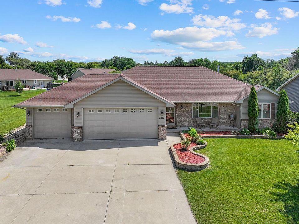Charming 3BR/2BA ranch home greets w/ cathedral ceilings, display alcove, gas FP & open-concept, split-bedroom layout & 6-panel doors. Fully-equipped kitchen w/ all appliances, pantry & island. Primary bedroom w/ lit-tray ceiling, walk-in closet & full en-suite bath. Adjacent 1st floor laundry conveniently located at entry to 3-stall garage includes washer & dryer! Opposite, beds 2 & 3 share a 2nd full bath. Sliding door opens from dinette to a curved paver patio w/ powered pergola overlooking a scenic shared pond. East De Pere Schools.