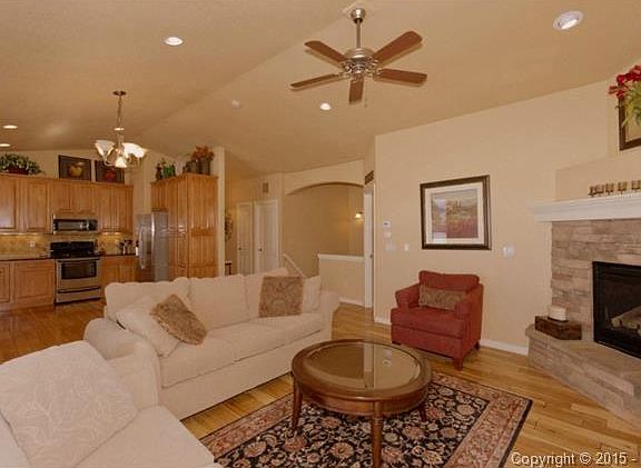Complete dream home! Everything you have been looking for! Custom, 2008 walkout rancher in beautiful established neighborhood! Stunning Pikes Peak views! 4" hickory plank wood on main floor from entry into dining and great rooms. 42" maple cabinets, slab granite counters, and stainless steel appliances. Gorgeous corner stone fireplace and vaulted ceilings. Large master bedroom with crown molding and large walkin closet. Custom tile in 5 piece bath. Second bedroom on main floor features bay window. Rich finishes throughout! Wide stairway that breaks with a small landing to basement. Huge rec room. Stone fireplace in walk-out. Very bright basement. Two large bedrooms with walk-in closets. Beautiful covered patio with composite decking. Quiet and private. Amazing gem!