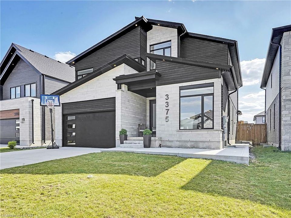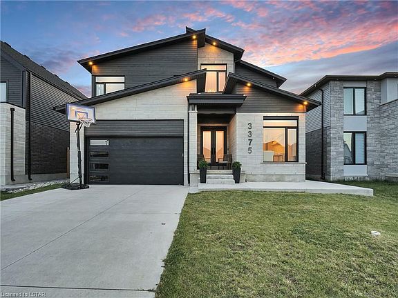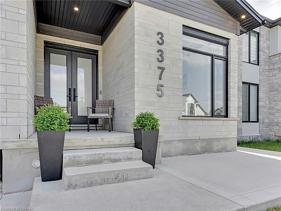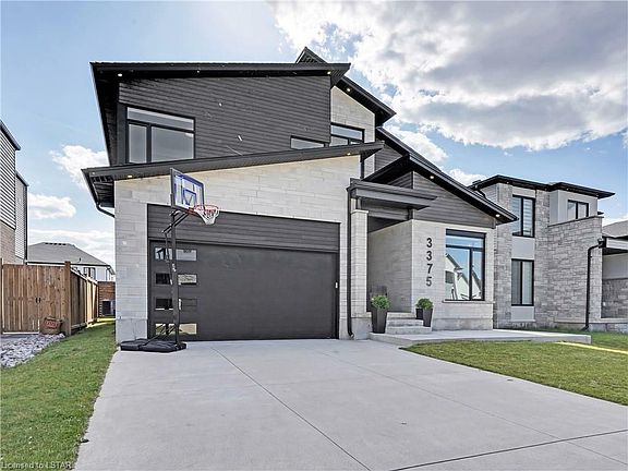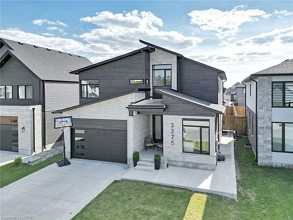 Welcome to 3375 Brushland Crescent. This modern 2-storey home spans approximately 3,800 square feet & features 9' ceilings & 8' doors. The striking exterior combines stone & wood elements, complemented by a concrete driveway that accommodates up to 4 vehicles. Attention to detail & customization are evident throughout this meticulously designed home, which offers 4+2 bedrooms & 4.5 bathrooms, along with a fully finished lower level. As you enter, you'll be captivated by the elegance of the main level, featuring hardwood floors, custom millwork, & sophisticated lighting. The thoughtful layout includes a den, a formal dining room with a custom wall niche, & a refined chef's kitchen. The kitchen boasts high-quality full-height cabinets, a large island with an under-lit waterfall quartz countertop, a quartz backsplash, a designer hood range, & a convenient pantry with sturdy wood shelving. The family room is enhanced by a stunning fireplace feature wall & in-ceiling speakers. Additionally, the main level includes an impressive mudroom with a charming bench & cubby, & a 2-piece powder room with a floating quartz sink. The second floor continues to impress with a luxurious primary bedroom suite that exudes a hotel-like ambiance. This suite includes a sumptuous 5-piece bathroom w/jacuzzi & a walk-in closet with custom built-in cabinets. Also on the second floor are a junior bedroom suite with its own ensuite bathroom, two additional large bedrooms, another full bathroom, & a convenient laundry room. The lower level offers a spacious rec room, a 3-piece bathroom, a bedroom, an office, & ample storage space. The backyard features a covered concrete patio, a pergola with privacy shutters, a powered shed, & full fencing, creating an ideal outdoor living area. Located just a short walk from the upcoming public elementary school, Southwest London School, set to open for the 2025/26 school year, & only minutes from the highway, retail shopping, restaurants, parks, trails, & more.