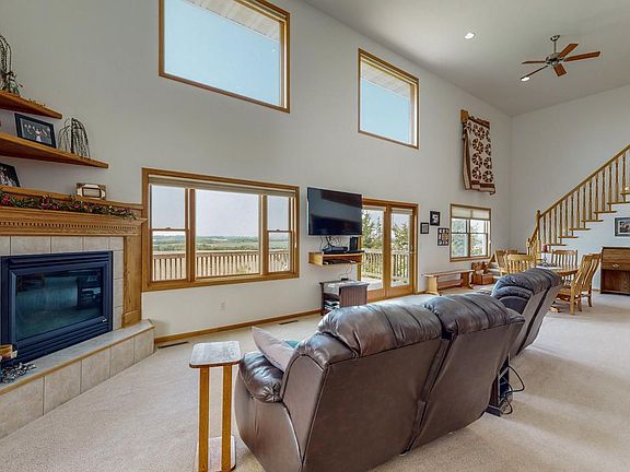 Custom built 1.5 story home situated high on the hill with a spectacular panoramic view! One-owner home features main floor living, nearly 4,000 square feet, 4 bedrooms, 4 bathrooms, quality windows, paneled doors, 2 fireplaces, new hand-crafted kitchen cabinets, granite countertops and a beautiful sunroom. Second story is dedicated to the private master suite boasting a large walk-in closet, full bathroom with whirlpool tub & separate shower. Finished walkout lower level offers generous space for entertaining and family room to include a golf putting area. Three car garage (840 sq. ft.) is insulated, heated and finished. Outside you can enjoy the peaceful setting, privacy, two patios, fire pit area, large deck, steel siding and breathtaking views. Must see this meticulously maintained home to appreciate!