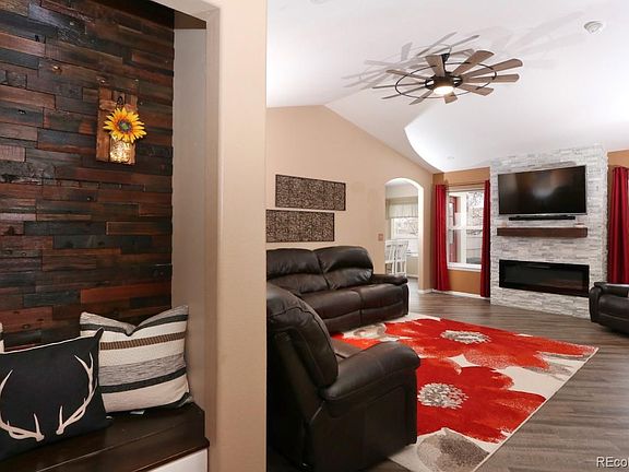 Step inside to discover sun-drenched rooms featuring vaulted ceilings that enhance the spacious feel of the home. The home has a thoughtful and inviting layout. Recent updates include a stunning rock wall with electric fireplace, wood mantle and space for a TV mount, luxury vinyl flooring and a kitchen remodel that boasts elegant quartz countertops, glass tile backsplash and modern appliances, ensuring both style and functionality for culinary enthusiasts.