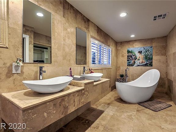 Fully RENOVATED just a few years ago!! OWC!!! NO HOA Next Generation home with style on 1/2 acre parcel! Each floor of this home is totally self sufficient, Large MASTER SUITE up and DOWNSTAIRS!! Gourmet "Entertainer's" kitchen(s) will not disappoint with the OPEN floor plan both up and down! High end finishes through out this unique home and the Master Baths are like you are in a resort! Views of the Strip and the mountains make this a desirable property. The paradise pool, swim up bar and Gazebo make it seem as if you are on vacation! Located close to all; The Strip, Chinatown, shopping, dining, airport, and the new Raider Stadium!! Welcome home!!!