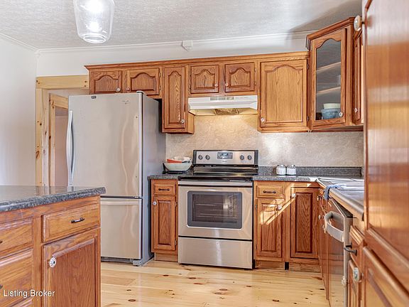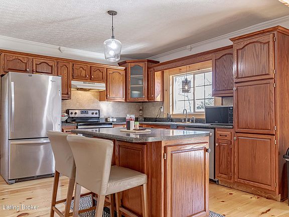 Looking for privacy? This gorgeous remodeled 1700sqft home is situated in just on the Butler/Grayson county line with 4.67+/- acres! Inside you will find pine wide plank flooring throughout as well as pine trim. Walk into the open remodeled kitchen and dining room area. This home includes 3 bedrooms and one full bath, large laundry room, living room and private deck off the primary bedroom. Outside is a 30'x48' detached garage with 3 garage doors, and separate entrance to additional living space, making it the perfect setup for the ultimate mancave, or apartment with kitchenette, full bath, finished room upstairs. This 4.67+/- acres is very flat and surrounded by woods. There is plenty of room for outdooe activities such as gardening, hobby livestock farming, hunting and more!