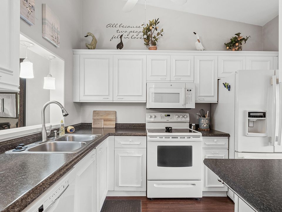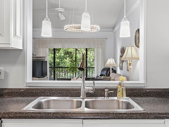 Tastefully Appointed 2nd FLR 55+ Condo in Cul-De-Sac. Newer Roof, & Accordion Shutters....AC 3 YRS Young. Classic White-on-White Kit W/ Garden Window, & Pass-Thru to Dining Area. State of the Art Liting thru-out w/built-in liting on Perimeter of LR. Dbl Dr Sliders Opens to Patio w/view of lovely trees for privacy. Mstr suite has Slder to Patio & ''Sitting or Desk Area''. Walk-in Closet boasts pull down stairs to Attic for Extra Storage, plus 2nd Closet. Mstr Bath has DBL Sinks & Separate Commode & Shower Rm. Guest Bath w/Tub adjacent to 2nd Bdrm on opposite end of Condo offers Max Privacy for Guests & has multiple uses featuring a Murphy Bed for Company. Park Pointe has numerous Clubs & Activities Plus Htd Pool, Pickleball, Grill Area, H20, Cable, Internet Inc. plus 1sm Pet Welcome!