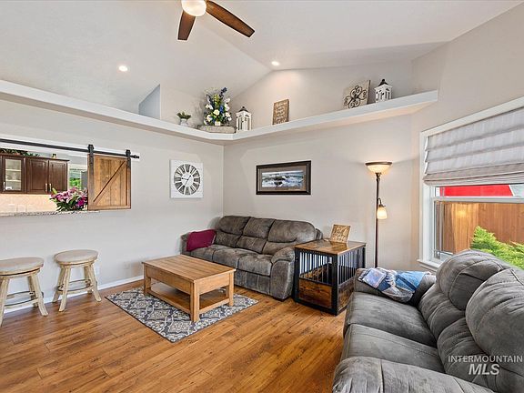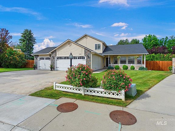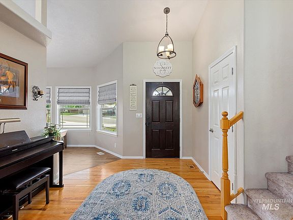 Welcome home to serene mature tree lined streets in the quiet sub of Summerfield! Centrally located in West Boise close to shopping, entertainment, and outdoor recreation. Fall in love with this amazing home sitting on a huge .37 acre lot with 6 mature apple and peach trees, fenced off garden & pool area, playground and more! Open concept light and bright flexible floorplan with vaulted ceilings. Entertain in your gourmet kitchen with upgraded granite counters, SS farmhouse sink, built in desk, and lovely barn door pass through window to the second living area. Main floor bedroom with built in Murphy bed and hard to find full bathroom. Upstairs primary suite with attached bath, 2 addl bedrooms and full bath. So many custom touches in this home with double insulation, holiday outlets, tv cord set up to neatly organize/hide cords, shelving, dual zone heat & air and much more! Newer roof and water heater. Enormous 4 car garage with pass through door. Secluded, shady backyard w/covered concrete patio.