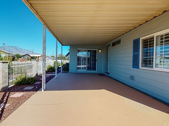 Open and spacious contemporary Manufacture Home. Located in Tri- Palm Estates 55 Plus senior community. The home offers a large living with plantation shutters throughout, carpet in bedrooms and open dining room.. Kitchen opens up to the family room dining area. Keep cool during those summer days and nights with your own private pool. 2 bedrooms and 2 baths all on a permanent foundation with 1744 square feet. A 2 car garage and an additional carport. Huge indoor laundry room with storage galore . The second bedroom has a good size closet. Master bedroom is large with two walk-in-closets that flow to the master bath which offers a tile shower. The back has a private pool with outdoor patio water misting hose system. Come and relax while you enjoy your morning coffee. Close to the shopping center, casino and easy access to freeways.