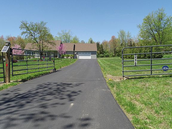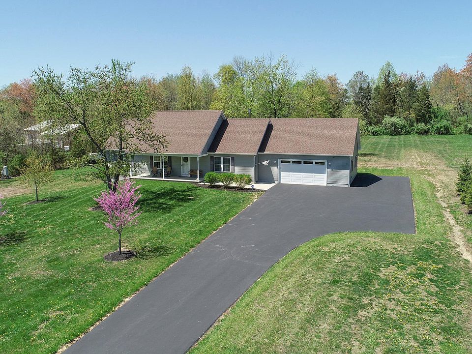 Welcome to this stunning custom-built home, completed in 2018, offering the ease of single-level living with endless potential for expansion. Tucked away behind an electric gate, this immaculate residence sits at the center of a level, 2+-acre lot, accessed by a long private driveway. Every detail of this home reflects pride of ownership and meticulous craftsmanship. Enjoy the peaceful setting from the inviting covered front porch, perfect for relaxing and taking in the surrounding landscape. Step inside to a spacious, open-concept living area featuring gleaming hardwood floors throughout. The living room, kitchen, and dining area flow seamlessly together, ideal for entertaining. The gourmet kitchen boasts solid wood white cabinetry with soft-close doors, granite countertops, four large pot drawers, a large pantry cabinet with pull-out draws and under-cabinet lighting. Cooking is a joy with a convection wall oven, a full stove with cooktop, and a large center island with pendant lighting and breakfast bar seating. The primary bedroom is bright and airy with recessed lighting, two large windows, and a ceiling fan. It includes a generous walk-in closet and a luxurious en-suite bathroom featuring an oversized walk-in shower and a dual-sink vanity. Down the hall from the dining area is the second bedroom, also equipped with recessed lighting and a ceiling fan. Currently used as a second living space, it offers flexibility to suit your needs. Accross the hallway, a full bathroom serves guests and residents alike. The home also includes a spacious laundry room with a utility sink and access to the two-car garage, which features a rear door opening to a fenced area—perfect for pets. A door from the living room leads up hardwood stairs to a full, unfinished attic, offering tremendous potential to add additional bedrooms and bathrooms. The expansive basement includes a wide-open area ready to be finished, with a large access door to the backyard—wide enough to drive a vehicle through. The utility section, including the Kinetico water system, of the basement houses all systems and includes a second washer/dryer hookup plus "Superior Walls". Outdoor living is equally impressive with a covered rear patio complete with lighted ceiling fans—ideal for enjoying the serene backyard. This home also offers dual heating systems for year-round comfort: an electric heat pump that provides both heating and cooling, and an oil-fed hot water baseboard system. Each has its own thermostat, allowing you to choose the most efficient or comfortable option for any season.
