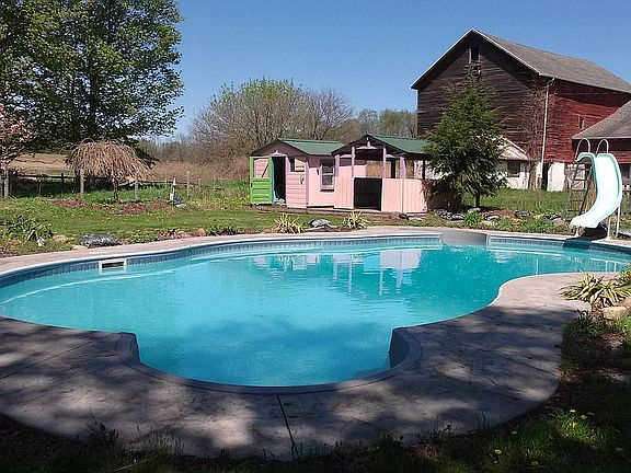 Updated farm house on 10 acres with pond! Public water & sewer, natural gas, a well is available for outdoor use, In-ground heated pool, All new electric(200 amp) & plumbing, dual heat zoned, hydronic heat, Numerous out buildings, 2 sheds w/ electric & water, 2 story pole barn garage w/ electric & water, old style (1850) barn (ok shape) plus pool house and cabana. Storage storage storage! It is located 15 miles east of downtown Rochester between Lake Ontario & Finger Lakes. This is a prime area for farming, winery or horse farm. With 10 acres there is room for options. School district is mid size with graduating class of around 200 students. Property is in process of being subdivided to 10 acres. Taxes shown reflect an additional 65 acres which are not included. Taxes on the 10 acres to be determined. Owner financing is available.