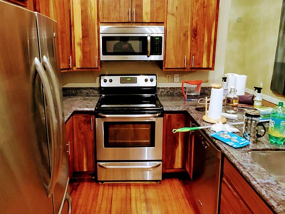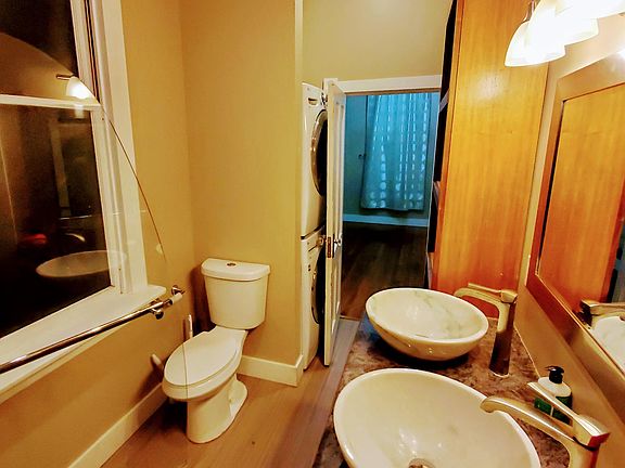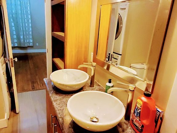 We spent three years thoroughly renovating this home located directly across from Swanson Park near the edge of downtown Albany at 338 6th Avenue SE, and this home won Albany's 2016 Historic Preservation award. We stripped the home to the studs and carefully rebuilt it to match its original historic character. For example, we built new double-hung windows from Douglas Fir to match the exact dimensions of the home's original windows. The kitchen's cabinets were all custom made from a black walnut tree in the front yard that was planted around 1890 by the home's first owner (a lady named Clarrissa Blount, who was a true Oregon pioneer -- she walked to Oregon from South Bend, Indiana in 1852). We also carefully restored the oak flooring we found hidden below layers of carpet and linoleum. The home now has three apartments: two first-floor one-bedroom apartments, and one second-floor three-bedroom apartment. This ad is for the front, first-floor, one-bedroom bedroom apartment. All wall, ceiling, and floor surfaces inside were brand new four years ago when the first tenants moved in. While the apartment doesn't look as pristine as it did then, it still looks great to our eye. The current tenant moved out Friday the 29th, and on Saturday we will clean and touch up the apartment. On Sunday the 31st from 1 to 3 we will hold an open house. It should be ready for you to move in on February 1st. All appliances are essentially new. The kitchen's stainless-steel appliance package includes a side-by-side refrigerator/freezer with ice-maker and water dispenser, a high-end dishwasher, disposal, wall-mounted microwave and self-cleaning oven with a glass cooktop. The kitchen has granite countertops and an extra-deep stainless steel undermount sink. The bathroom has new one-piece toilet, a full-size historic cast-iron tub with a plate glass surround for use as a shower, and a granite-topped vanity with dual marble sinks. One end of the bathroom has an essentially new stackable front-loading washer and dryer set. The bedroom has a walk-in closet. The living room has built-in wall speakers, a 10-inch subwoofer, custom-built granite-topped walnut entertainment cabinet, and a 5.1 audio-visual receiver. If you'd like, we will leave the flat-screen TV shown in the photos to complete this home's theatre system. The main living area is heated and cooled by a wall-mounted heat pump. The home is historic, so it isn't as tightly built as current codes require, but the heat pump will provide relatively inexpensive winter-time heat along with air conditioning on hot summer days. The bedroom has a wall-mounted Cadet heater that is much less efficient ... so we recommend using it sparingly. Also, we recently added R19 insulation under all the flooring. If you need extra storage space, that's available in the home's basement and the 1925 carriage house. Nearly all photos in this ad were taken on Friday as the last tenant was check out. Of course, it won't look the same once it's filled with your stuff. We want $1,000/month in rent along with a $1,000 damage deposit. No one has smoked in this apartment and we want it to stay that way. Our two kitties are part of our family,, and we don't understand why other landlords have such pet-hostile policies. So we don't charge additional rent or deposits if you have pets. The total move-in cost for a February 1st move-in date would be to pay $1,000 for February's rent plus $1,000 for the security deposit. We will pay for water, sewage, and garbage: you would pay for all other utilities. If you are interested in renting this apartment, then you should come to the open house we will hold on Sunday, January 31st from 1 to 3 p.m. That will let you see for yourself what it would be like to live in this historic home. If you like what you see, we will have rental applications and draft rental agreements at the open house. We've found this approach should give you ample opportunity to see the home and fill out paperwork. We do not charge anything for filling out a rental application, and we will treat all applications that we receive on Sunday as if they were received simultaneously. Then we will screen application(s). If you are approved, we will all sign a month-to-month rental agreement to make sure everyone understands exactly how the agreement will work. If you have questions, contact Dave or Barb Sullivan by phoning our Google Voice number: show contact info . We live a few miles outside Monmouth on a piece of timberland and we manage about a dozen rental units to supplement our retirement, so you won't be dealing with an impersonal management company. In good cheer, -- Dave and Barb Sullivan