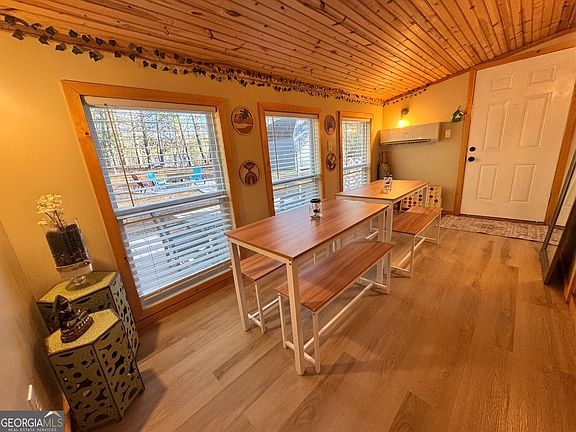Charming two-story cabin located in a desirable lake community, set on over an acre of private, usable, and unrestricted land. The property features a 30-amp RV hookup with water and sewer, three storage buildings for ample space, and a fully fenced backyard for added security. Plenty of off-street parking is available, and community lake access is just a few blocks away. Designed for comfortable, low-maintenance living, the home offers engineered wood flooring, a brick-textured kitchen backsplash and accent living room wall, and a gas stove fireplace that serves as the centerpiece of the living area-perfect for cozy evenings. Blending rustic charm with contemporary style, this two-bedroom, one-bath retreat is surrounded by nature and best enjoyed from the rocking-chair front porch, the private backyard deck, a custom fire pit, or the hot tub under the stars. Conveniently located near the lake and endless outdoor recreation, including hiking and biking trails, swimming and fishing spots, and just a short scenic drive to town for shopping, dining, golf, and parks. This property would make an excellent personal getaway or income-producing rental. Ideal for gatherings, hunting and fishing trips, or hosting large groups, the home comfortably accommodates up to 6 guests and two sheds and a garage to store your car,atv etc, with additional RV connections allowing for more visitors or rental potential. Peace, privacy, and mountain living await-escape the hustle and enjoy crisp mountain air just minutes from Lake Nottely and all the beauty of the North Georgia mountains. Some furnishings may remain. Affordable tranquility awaits in this newly renovated home with easy access and a level yard. RV hookups offer flexibility for extended family or guests, while a powered workshop, in-house laundry, and energy-efficient upgrades add convenience. A brand-new Panasonic ductless unit efficiently heats and cools the entire home. Warm wood ceilings and a tiled bath enhance the cozy cabin feel. Bring your boat and fishing gear-Lake Nottely is just minutes away. Currently operating as a nightly rental; furnishings are negotiable.