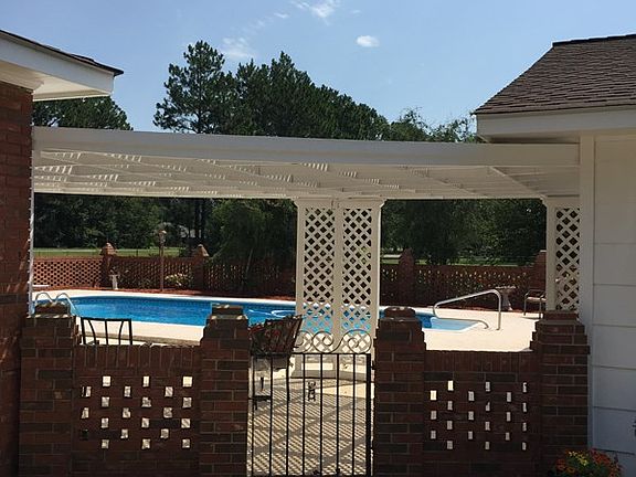 The perfect package! 3 bdrm/3 bth brick home with separate master suites on opposite ends of home. Newly painted walls, fireplace & cabinetry throughout! New quartz kitchen countertops with tile back splash. Masonry fireplace in living room. Large sunroom viewing In-ground POOL with gorgeous brick gate. Beautiful pond, fully fenced. 1100+ sq ft Apartment/Mother-in-law suite/guest house with 2 bdrms/1 bth. Refrigerator, stove included with rental house! 4-car carport & parking pad/basketball court on back & more parking! Heated/cooled workshop. 2+ acres. Architectural shingles, 3 water heaters. 4 A/C compressors. Landscaped yard. Move-in ready!