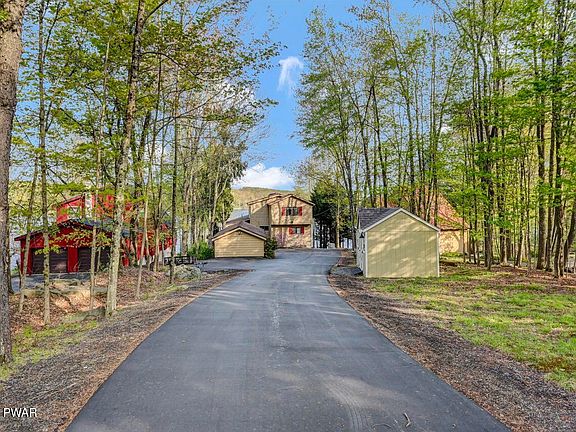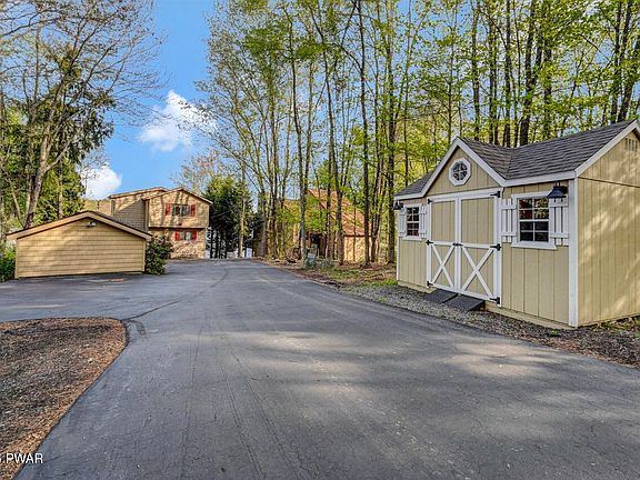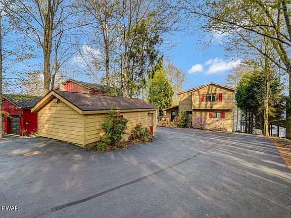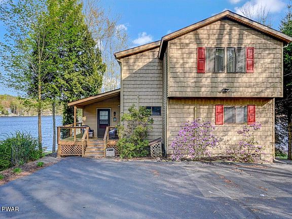 Lakefront Retreat on Roamingwood Lake in The HideoutDiscover this beautifully updated lakefront home on Roamingwood Lake, a powerboating lake in The Hideout--an amenity-filled, gated community in the Northern Poconos. Set on a level lot that extends farther than its neighbors, this property offers enhanced privacy and incredible lake views.A long paved driveway leads to the vinyl-sided home with charming cedar shake-style detail. Enjoy outdoor living with a spacious lakeside deck featuring cable railings for unobstructed views, a covered lower-level patio, a new bulkhead with steps to the water, an EZ Dock system, lakeside firepit, and a deck with canopy--perfect for relaxing or entertaining by the water. The gently sloped, grassy yard is ideal for play, and there's a garage plus two sheds for all your lake gear.Inside, a window-filled entry sunroom welcomes you into the open-concept kitchen, dining, and living areas with whitewashed ceilings, a cozy propane stone fireplace, and laminate flooring. The main level also features a large laundry room and the primary bedroom. Mini-split A/C and heating units are located throughout the home for year-round comfort.Upstairs, knotty pine ceilings and chalet-style windows frame stunning lake views--telescope included! You'll find three additional bedrooms and a full bathroom, including a whimsical ''bunk'' room the kids will love.The finished lower level includes the fifth bedroom with sliding glass doors to the lake, a recreation room with a Murphy bed, the third full bathroom, and an unfinished workshop with walk-out access.This home is being offered fully furnished--move right in and start enjoying lake life!