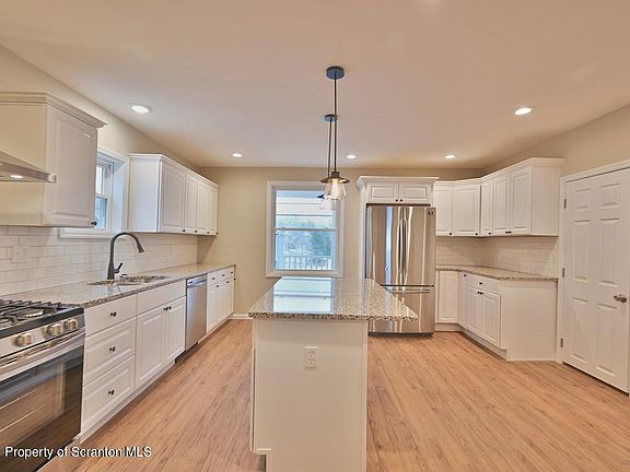 This stunning 3 Bed 2.5 Bath places you right in Cougar Country. House is located on hill very close to Lackawanna River and Heritage Trail. Park and baseball fields sit next to the Lackawanna River. Home has new Forced Air/Central Air system, new roof, and new vinyl siding. Ultra Modern with open plan on first level. Laundry Room and 1/2 bath located right at door to keep living area clean. Kitchen offers Granite countertops with island and new appliances. Spacious upstairs with large bedrooms.