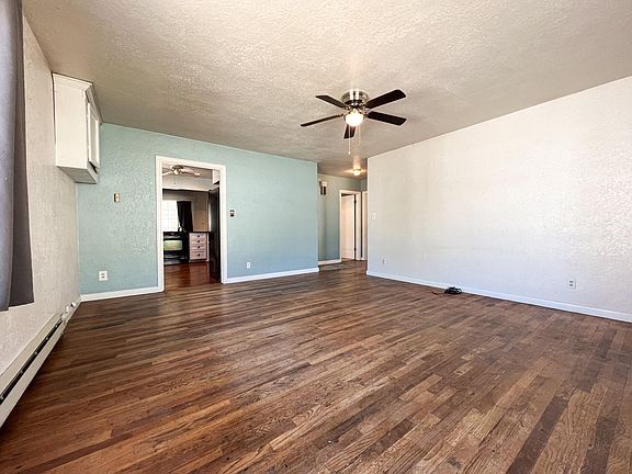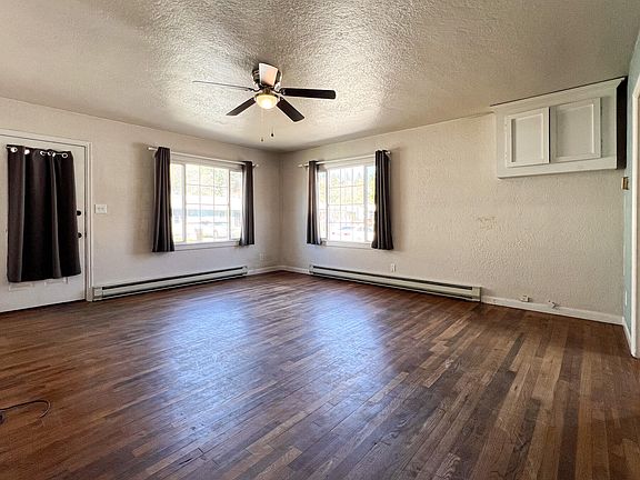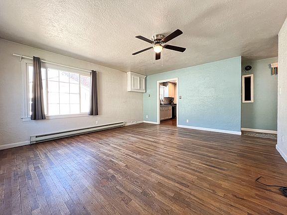 Welcome to 338 N. Humbolt, where you are greeted by beautiful hardwood floors as soon as you enter. The sightlines lead you to the updated kitchen, boasting newer cabinets, countertops, appliances with propane stove, and flooring. The two spacious bedrooms offer comfort, while the bathroom features a double vanity and a tub-shower combination. Step outside to find a covered deck that leads to a 440 sq ft outbuilding. Inside, you'll discover a partially finished room with laundry facilities, a half bath, and a versatile flex space. The other side of the outbuilding features built-in storage shelves, a workbench, and there is also wood storage. The front yard is equipped with underground sprinklers. Additional amenities include a wood stove, electric baseboard heating, and a wall AC unit. Outside stucco is being repaired, exterior of home to be painted along with trim.