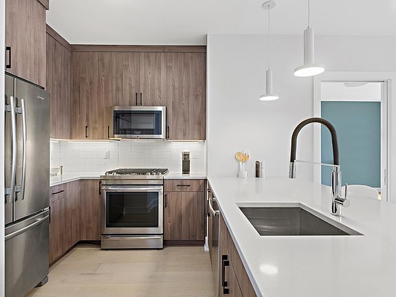 At 338 Newark, one and two bedroom homes cater to modern sensibilities with upscale contemporary conveniences along with layouts that embrace sunlight and views. Unit 301 features two bedrooms and two bathrooms in a desirable split floor plan, this home is flooded with natural light from Southern exposure floor to ceiling windows in every room. Unwind in your luxurious primary suite with custom walk-in closet and spa-like double vanity bathroom, while your second bedroom is perfect as a home office, guest room or nursery. Throughout each home you will find spacious living and dining spaces accented by white oak hardwood floors and floor to ceiling windows, while gourmet kitchens impress with custom cabinetry and fully vented gas ranges, Caesarstone counters and a suite of premium JennAir kitchen appliances and full size front load LG washer and vented gas dryer. This thoughtfully planned elevator building features a wealth of indoor-outdoor amenities, including a fully-equipped fitness center and co-working space, plus a rooftop lounge with wet bar and an outdoor deck with breathtaking views and barbecue grill. We complete the picture with an inviting lobby, Butterfly MX smart-access intercom, package room, stroller and bike storage, and resident storage lockers. Rental parking available 1.5 blocks away. Located in Jersey City’s trend setting Village West Neighborhood, these well-appointed homes deliver designer interiors, exceptional amenities and easy access to the city's best parks, restaurants and transit options.