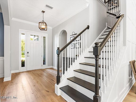 Exclusive Gated Community of Coastal Oaks in Nocatee. This Stonebrook Floorplan by Toll Brothers boasts open spaces to allow for Family gatherings. The kitchen has upbundant upgrades with a renovated kitchen island and cabinets. New large plank flooring throughout the 1st floor. Upstairs you'll find the Primary Suite, 2 guest rooms, a loft and a massive Bonus Room used as a Home Theater. Enjoy the Conservation Preserve where Outdoor Enhancement was professionally built to entertain with a built in gas fire pit, covered pergola and screened in lanai. Located on the same street as the exclusive neighborhood pools, fitness center and clubhouse which is also a cut-de-sac street. Exclusive tennis courts, basketball, soccer fields and nature boardwalks are in addition to the Nocatee amenities.