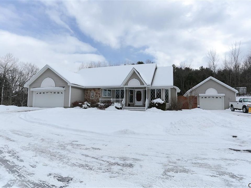 Wow, Custom built ranch home on 2.45 acres. Vaulted post and beam ceilings in Living Rm w/ gas fireplace; Master suite overlooking wooded private yard and multi-tiered decking w/pool. Bright sun filled windows everywhere! Eat-in kitchen with Maple cabinetry. 1st flr Laundry Rm. Walk in closets in every Bedrm. Finished basement w/ cedar accent walls in Fam Rm. Heated Garages! SEE TOUR BELOW