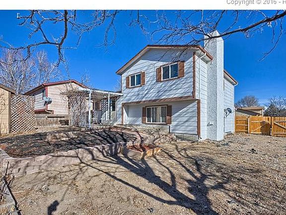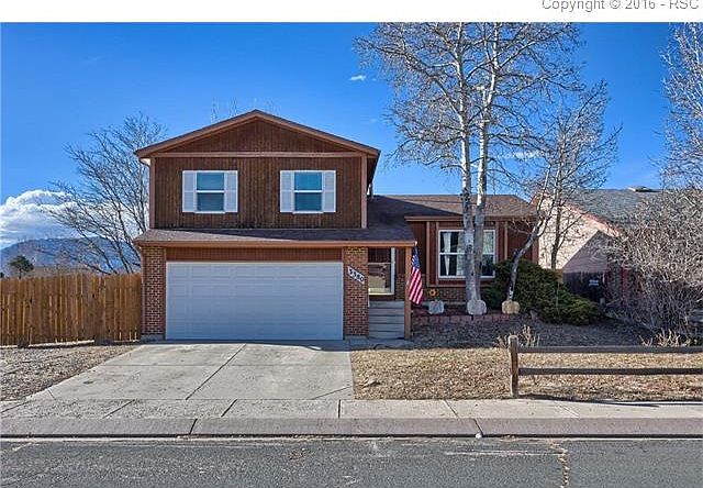 This charmer is situated on a corner lot with 3 bedrooms, 2 bathrooms, a 2 car garage with a WOOD burning fireplace! The interior of this home is immaculate with beautiful hardwood floors on the main level and newer carpet on the upper level. The inviting kitchen has a brand new stainless steel side by side refrigerator, stainless steel microwave, stove/oven and dishwasher with a decorative mosaic tile back splash and a tile floor. It is open to the dining area which walks out to the back yard and the family room. The dining area is large enough for a table and walks out to the gorgeous covered patio to include breathtaking Mountain views. Perfect for barbecues and entertaining. The lower family room is cozy in the winter as it includes a brick surround wood burning fireplace- that can heat the whole house - and a door that attaches a 2 car garage with a brand new garage door. The Upper level has 3 bedrooms, a full bathroom and laundry space. The master is spacious with a ceiling fan and lots of natural light streaming in. The dedicated master bath is attached for privacy with a nice walk in shower. Exterior of the home has a large fenced in back yard with a newer fence, is great for gardening, has stunning Mountain views and a storage shed to hold all those gardening tools. The gate opens up so you can pull a camper or RV behind the fence. This home is located close to Fort Carson and Peterson Air Force Base as well as close to Powers corridor near shopping and restaurants. A little gem that is a MUST SEE!
