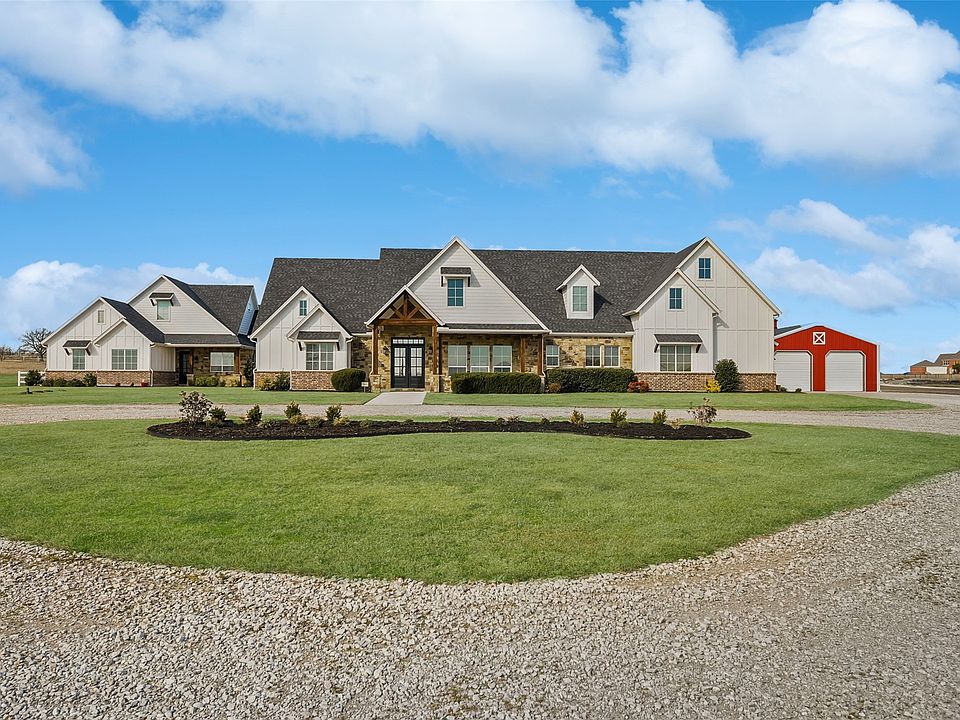 Welcome to this stunning 3,600 SF modern farmhouse plus 1,687 SF guest house on an expansive 5 AC lot in Ponder. This inviting home features an open floor plan that blends comfort with functionality, perfect for entertaining. Large windows allow natural light to flood the rooms, creating a warm and welcoming atmosphere. A formal dining room greets you and leads you into the heart of the home, the family room, with doors that open to the backyard retreat and a warm stone fireplace. The kitchen is equipped with top-of-the-line appliances, ample counter space, an island with seating, and a prep pantry, making it a perfect spot for culinary creations and meals. The primary suite features an en-suite bathroom with a double vanity, a walk-in shower, and a claw-foot tub for soaking, providing a tranquil escape at the end of the day. The main floor is complete with a guest suite, full bathroom, utility, and mud room. Upstairs, a sprawling game room and a generously sized secondary bedroom. The pool house boasts a sprawling great room, a fully equipped kitchen, a primary suite, a secondary bedroom, two full bathrooms, and a utility room. Enjoy relaxing on the many covered porches and patios, swimming in the sparkling pool and spa, or preparing dinner in the outdoor kitchen with a pizza oven! Live a peaceful rural lifestyle with room to roam and easy access to major highways, making commuting to nearby cities a breeze. Don't miss the opportunity to make this lovely property your new home!