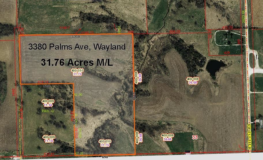31+ Acres M/L located approximately 1- mile north of Wayland on Lincoln St./Clayton Ave. Property consists of approximately 16.7 Acres Tillable, and 14.5 Acres of Pasture. Would make nice homestead, add on acres or small farm. Pasture has potential for large pond/lake that would be spring fed. Conveniently located near Wayland for Schools etc. and short drive to Hwy 218, and only 10 miles to Washington.
