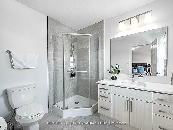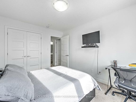Welcome to this sleek and stylish 4-year-old multi-level condo row house, located in a highly desirable area between White Oaks and Westwood Power Centre. This well-maintained home with 3 bedrooms and 2.5 baths offers contemporary living with thoughtful design and ample space for your lifestyle.Step into the inviting front foyer, featuring ceramic tile flooring and convenient access to the one-car garage. The open-concept main floor is perfect for entertaining, with a modern kitchen boasting a tile backsplash, large center island with an eating bar, and stainless steel appliances. The kitchen flows seamlessly into the spacious dining area and adjacent living room, all designed with a sleek, modern aesthetic.The second level is a retreat, offering a primary bedroom with a private three-piece ensuite and a walk-in closet. The upper level features two additional generously sized bedrooms, a four-piece bath, and a laundry area for added convenience.The lower level offers a bright and versatile family room with custom-built shelving, including custom lighting - a perfect space for games, relaxation, or activities. Step outside to your private deck from dining room, which overlooks a serene common green space, ideal for quiet moments or outdoor gatherings.This unit includes exclusive driveway and garage parking, as well as access to visitor parking. Conveniently located close to shopping, schools, restaurants, and with extremely easy access to Highway 401, this home combines modern living with unbeatable convenience.