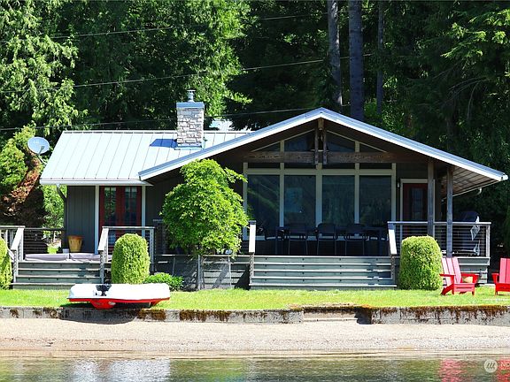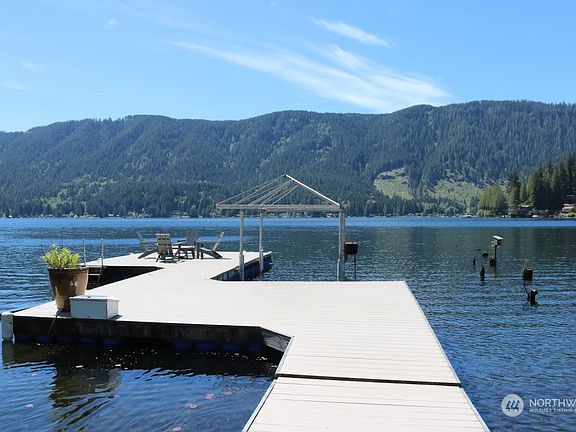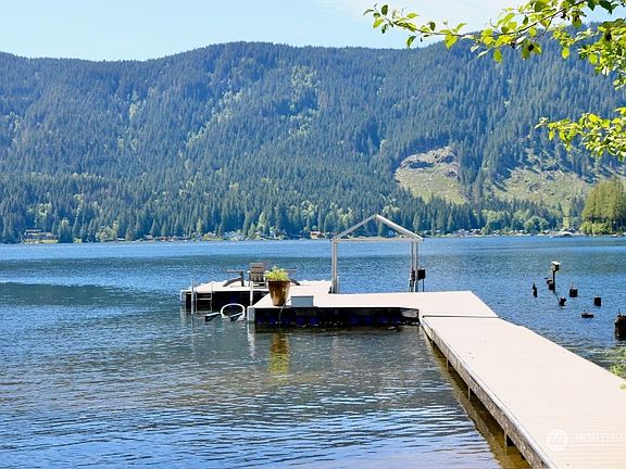 Rare opportunity to buy highly sought-after North Shore Lake Cavanaugh cabin. Great beach with oversized dock, boat lift and Sea-do lift. Adorable cabin features living area with fireplace, dining area, well-equipped kitchen, main bedroom w/french doors that open to hot tub on the covered iron wood deck. Additional bedroom with built-in bunk beds, laundry room also used as bedroom. Heated 1600 sq ft. garage that includes 324 sq. ft. media room with propane fireplace, built in wine/beverage cooler and 1/2 bath. 30 amp RV hookup with sewer drain. All of this on 2 level lots, This one will go fast so don't dawdle!