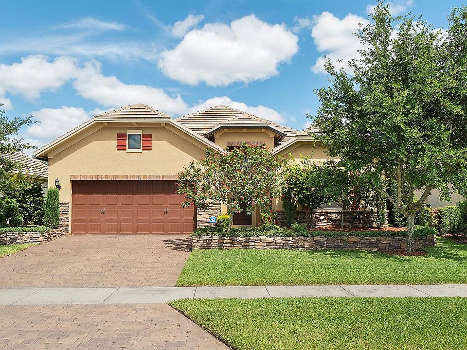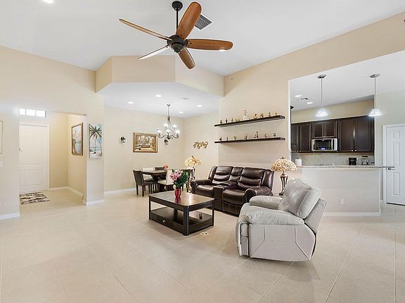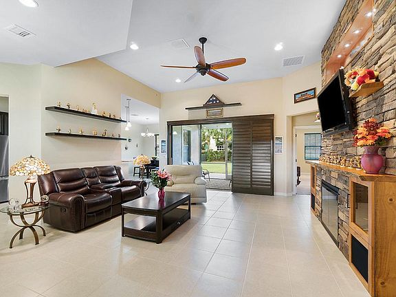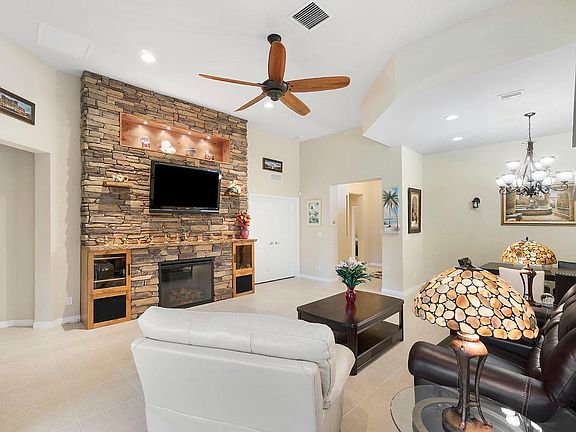 Highly desirable & rarely available Portsmouth model on large, private lot! Elegant entry welcomes you and your guests! Upgraded kitchen w/ 42''raised panel ebony-stained Birch cabinets, stainless steel gas appliances, granite counter tops, breakfast bar + breakfast nook. Custom made stacked stone hearth w/ remote controlled fireplace, wood shelves, accent lighting & glass cabinets. Large great room and separate formal dining room. Plantation shutters! Generous master bedroom retreat w/ double walk-in closets & large bathroom. Enjoy sunrises on covered, screened-in lanai.