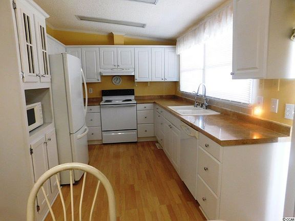 Wonderful 3 bedroom, 2 bath manufactured home featuring brick underpinning on a terrific lot in desirable North Pointe. Home boasts an open airy split bedroom plan with tons of windows to provide a bright, light atmosphere throughout. Enter home on a large, covered porch and walk into a huge family room totally open to both the dining room and kitchen. Kitchen has all white cabinets and white appliances to include a range, dishwasher, and refrigerator/freezer combination. Floors are a light oak wood laminate with tons of cabinets and counter space, plus a cabinet perfect for pantry and area for microwave. From kitchen and dining area are sliders leading to an awesome (14x10) deck overlooking back yard and expanding the outside living space for entertaining family and guests. Master bedroom is quite large and boasts a large walk-in shower and tiled floors with plenty of windows for a bright light atmosphere. Walk to other part of home and find another full bath with tiled floors, tub/shower and masterfully placed for guests, plus provides great access for the other 2 large bedrooms. Both bedrooms are spacious, and each have their own walk-in-closet. Enjoy this meticulously maintained home. You can enjoy your coffee or cool drinks on either your spacious covered 18x5 front porch or your large back deck. (14'X10) In addition, the home comes with a double concrete drive (allowing parking for 6 cars) and a matching storage building (12x14'7) for all your yard tools and beach toys. Enjoy your day on the beach in desirable North Myrtle Beach and enjoy all it has to offer you - restaurants, dancing, shopping, golf and yes the ocean all minutes away. Homes has a new H/VAC system (2016) and new roof (2015). See this one, you'll want to call it yours.