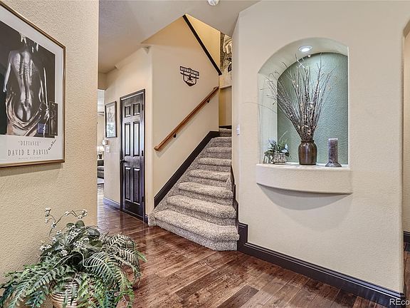 Beautiful, remodeled and completed finished three level condominium on the 5th fairway of the Plum Creek Golf Course in the highly-desired Plum Creek area of Castle Rock. Home includes rich, hand-scraped Amish wood floors on the main and lower level. Travertine tile featured in the kitchen and bathrooms. Huge master suite with French door entry-way, high vaulted ceilings and large bay window area overlooking the golf course plus large walk-in closet. Master bath features a marble floor, frame-less, custom patterned glass enclosure and soaking tub. Custom stone gas fireplace in main living area with built in television niche and surround sound. Large deck offering great views and privacy with mature trees. Kitchen and bar include granite countertops, Kenmore Elite gas range, stainless exhaust hood and ultra-quiet, high-end Bosch dishwasher Two car garage with built-in shelving/storage/work bench on one side wall. Lower level includes another full bath in Travertine tile, custom vanities/sink, remodeled laundry room and another storage room adjacent. Much more storage in huge closet under the stairs. Hand-scraped wood floors throughout living area/den/man-cave in "daylight basement" configuration with huge windows and matching "black-out" window shades. Built-in to the wall for a television "framed" in the 75" range which includes custom electrical conduit through the walls plus built-in 5.1 surround-sound speaker system. Rain Soft water-softening system with extra storage room as well. The two car garage comes with a garage door opener and plenty of room for two more cars in the large driveway off of the street. HOA fees include exterior building maintenance, landscaping, mowing, snow removal, association pool and hot-tub maintenance, water bill and parking areas. This beautiful property is located just a few minutes from I-25 in addition to shops and dinning in downtown Castle Rock.